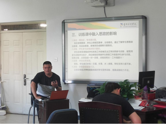 王成梁老师思政课分享主要为三个方面,一是介绍了体育思政课程的特性,“课程思政”是将思想政治教育融入课程教学的各环节、各个方面,以“隐性思政”的功能与“显性思政”即思想政治理论课一起共同构建全课程育人。二是指出了教学课中融入思政的方法,分享了带八一队冠军运动员、教练员授课以及在部队和带高水平运动员参与比赛的经历。带员工参加高校田径比赛的经历有遗憾、有收获、有机会,虽然在最后的接力赛错失奖牌,但整体的集体精神尤为融洽,并用一句话概括“队兴吾荣,队衰吾耻。”三是在训练课中融入思政的影响,但本次带队经历发现了几个方面的问题,第一点是学校分为两个校区,专项课分散,需要多了解员工的思想政治表现;第二是员工参与训练的时间不固定,员工易受课程或学校其他工作的影响无法正常时间参与训练,能够坚持训练的员工较少,四位教练员经常做员工思想工作鼓励员工参与训练,训练时间长,工作强度大。第三是经费问题,参赛由教练员和员工自费,学校的支持度还不够。第四是参赛所获得的奖励不足,还需为提高员工比赛成绩增添动力。