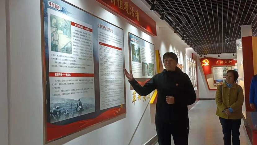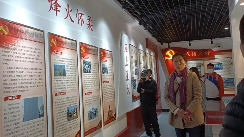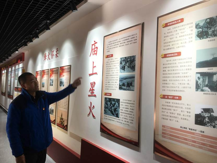 展厅第一部分“点播火种”介绍了抗日战争时期怀柔根据地的成立,在高万章的带领下于1940年组织建立了庙上村党支部,“个子高,身体壮,军人作风斗志旺,牢记区委来庙上,声东击西山上创,汉奸特务记上账,最大恶极枪子撞,忆历史,庙上支部是他创——第一书记高万章”这段顺口溜一直流传至今,反映了第一书记高万章同志当年在庙上村率领群众开展革命斗争的历史场景。李越苹表示:中国有千千万万个党支部,均由中国共产党员组成,毛泽东主席曾在文章中说过星星之火可以燎原,所有的党员同志就像是一粒种子,播种共产主义思想,践行新时代中国特色社会主义建设使命,先辈们英勇奋战的精神令我们党员同志深受教育,李越萍同志还说自己作为一名老党员,看到这些非常激动,一定会向革命英雄学习,把革命精神传承下去。